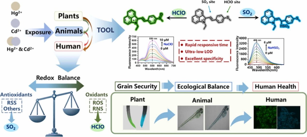 探针D-P的分子结构中,苯基硫醚与C=C双键分别作为次氯酸(HClO)和二氧化硫(SO2)的特异性响应位点;二者与对应底物反应生成不同化合物,并产生不同发射波长的荧光,从而实现对HClO和SO2衍生物的区分检测。该探针能有效应用于植物、斑马鱼及人类细胞中,实时监测HClO与SO2衍生物的动态变化。研究显示,重金属Hg2+/Cd2+复合暴露可引起植物和人体细胞中活性氧物种(如HClO)含量显著上升,复合暴露进一步加剧机体氧化应激水平,且存在协同增强效应。与此同时,机体通过激活自我防御机制调节SO2衍生物的生成量,以应对氧化损伤并试图维持氧化还原平衡。因此,SO2衍生物的变化可间接反映细胞抗氧化应激的过程。本工作通过监测环境胁迫下机体活性分子的波动变化,在分子与活体层面上深入探究其作用机制;为探索重金属复合污染暴露的毒理效应、解析“污染与健康”之间的复杂关系提供了理论依据和技术支持。