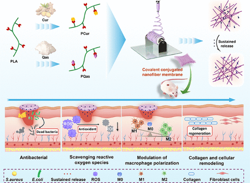 基于以上现状,本研究的核心突破是采用“共价共轭”策略替代传统“物理混合”,将抗炎抗氧化的姜黄素(Cur)、杀菌的季铵盐(Qas)通过共价连接到聚乳酸(PLA)上,构建两种功能的PCur、PQas 纳米纤维膜。结果显示,新型PCur、PQas纳米纤维膜敷料可让有效成分持续释放21天(物理混合<72小时);体外实验中,PCur 抗氧化抗炎效果显著,PQas对致病菌抑制率近99%;体内实验(小鼠)14天伤口闭合率达97.8%,且无全身毒性。该研究以“慢性感染伤口的病理需求”为导向,通过“共价共轭”这一核心技术,将材料工程与生物医学结合,构建出功能协同、长效安全的纳米纤维敷料。其不仅验证了新型敷料的疗效,更提供了一种“按伤口愈合周期设计药物释放”的研究思路,为慢性伤口治疗领域的技术突破奠定了基础。