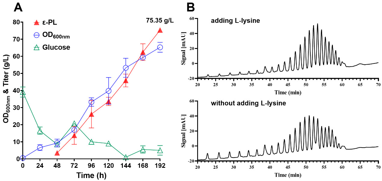 ε-聚赖氨酸(ε-PL)是一种由25–35个L-赖氨酸残基组成的天然抗菌多肽,广泛应用于食品保鲜、医药和功能材料等领域。然而,其产业化面临两大挑战:肽链长度难以精确控制,以及低分子量ε-PL产量低。基于以上现状,研究团队在小白链霉菌(Streptomyces albulus)中引入了突变型聚赖氨酸合成酶Pls-S880I,并结合赖氨酸转运蛋白LysP的共表达以及不同碳源的使用,成功实现四种不同链长ε-PL(28–34、25–32、23–31和19–30 mer)的生产。通过统计学优化培养基与补料分批发酵,所有四种ε-PL变体的产量均突破50 g/L,其中低分子量变体(23–31 mer)在补加L-赖氨酸后产量高达75.35 g/L,创下该链长ε-PL的最高生产纪录。抗菌实验进一步揭示了链长与抑菌活性的构效关系,为ε-PL的精准应用提供了理论依据。本研究建立了一套“基因–发酵–链长–活性”联动的ε-PL可控生产技术体系,首次实现了从天然链长到低分子量变体的高效、可调控生产,突破了低分子量ε-PL长期存在的产量瓶颈。该技术不仅为ε-PL在食品、医药、化妆品等领域的精准应用提供了物质基础,也为其他微生物多肽的链长工程化生产提供了可借鉴的策略。