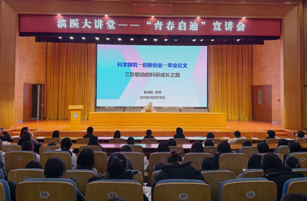 12月17日晚,学校2025年滨医大讲堂“青春启迪”宣讲会在荣祥楼学术报告厅举办。此次宣讲会由校团委主办、药学院团委承办。药学院秦加阳教授以“助力本科生科研成长”为主题进行宣讲,400余名在校生到场参加本次活动。